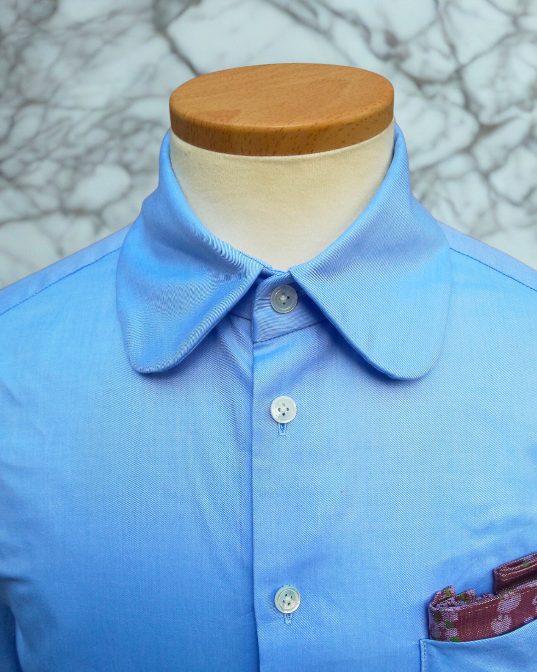 セミワイドラウンドカラーと白蝶貝のダブルボタン。